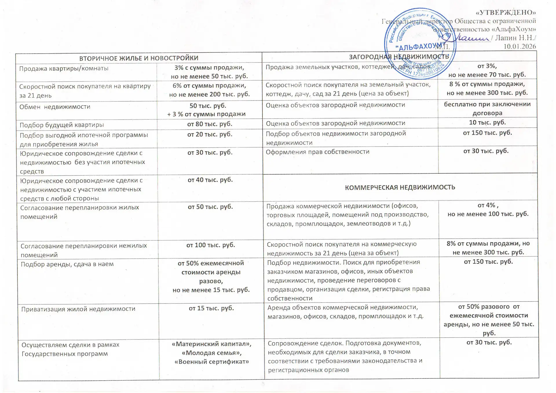 1.7. Прайс-лист – перечень услуг и цен, опубликованный на Сайте в разделе «Услуги и цены» (включая цены из файла «Стоимость услуг АльфаХоум 10.01.2026.pdf» и его актуальных обновлений).